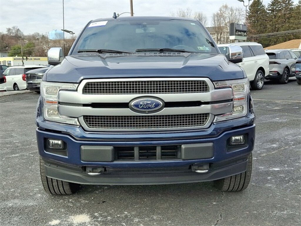 Certified. Blue 2019 Ford F-150 Platinum 4WD 10-Speed Automatic 3.5L V6 EcoBoost 4WD, 10 Speakers, 20" Polished Aluminum Wheels, 4-Wheel Disc Brakes, 4x4 FX4 Off-Road Bodyside Decal, ABS brakes, Active Park Assist, Adaptive Cruise Control, Adjustable pedals, Air Conditioning, AM/FM radio: SiriusXM, AppLink/Apple CarPlay and Android Auto, Auto High-beam Headlights, Auto tilt-away steering wheel, Auto-dimming door mirrors, Auto-dimming Rear-View mirror, Automatic temperature control, Black Unique Multi-Contour Leather Bucket Seats, Box Side Steps, Brake assist, Bumpers: body-color, Class IV Trailer Hitch Receiver, Compass, Delay-off headlights, Driver door bin, Driver vanity mirror, Dual front impact airbags, Dual front side impact airbags, Electronic Locking w/3.55 Axle Ratio, Electronic Stability Control, Emergency communication system: SYNC 3 911 Assist, Engine Oil Cooler, Equipment Group 701A Luxury, Extended Range 36 Gallon Fuel Tank, Exterior Parking Camera Rear, Front anti-roll bar, Front Bucket Seats, Front Center Armrest, Front dual zone A/C, Front fog lights, Front reading lights, Front wheel independent suspension, Fully automatic headlights, FX4 Off-Road Package, Garage door transmitter, Genuine wood door panel insert, GVWR: 7,050 lbs Payload Package, Heated door mirrors, Heated front seats, Heated rear seats, Heated steering wheel, Hill Descent Control, Illuminated entry, Integrated Trailer Brake Controller, Lane-Keeping System, Low tire pressure warning, Max Trailer Tow Package, Memory seat, Navigation System, Occupant sensing airbag, Off-Road Tuned Front Shock Absorbers, Outside temperature display, Overhead airbag, Overhead console, Panic alarm, Passenger door bin, Passenger vanity mirror, Pedal memory, Power door mirrors, Power driver seat, Power passenger seat, Power steering, Power windows, Pro Trailer Backup Assist, Radio: B&O Sound System by Bang & Olufsen, Rain sensing wipers, Rear Parking Sensors, Rear reading lights, Rear seat center armrest, Rear step bumper, Rear window defroster, Remote keyless entry, Security system, SiriusXM Radio, Speed control, Speed-sensing steering, Split folding rear seat, Steering wheel memory, Steering wheel mounted audio controls, SYNC 3, Tachometer, Tailgate Step w/Tailgate Lift Assist, Technology Package, Telescoping steering wheel, Tilt steering wheel, Traction control, Trailer Tow Package, Tray Style Floor Liner, Trip computer, Turn signal indicator mirrors, Twin Panel Moonroof, Upgraded Front Stabilizer Bar, Variably intermittent wipers, Ventilated front seats, Voice-Activated Touchscreen Navigation, Voltmeter.
