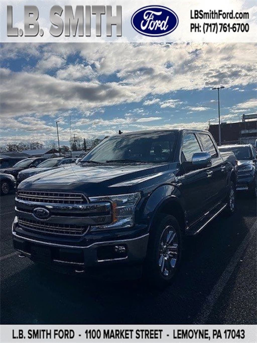 Blue 2020 Ford F-150 Lariat 4WD 10-Speed Automatic 3.5L V6 EcoBoost 4WD, 110V/400W Outlet, 4-Wheel Disc Brakes, 4x4 FX4 Off-Road Bodyside Decal, 7 Speakers, ABS brakes, Adjustable pedals, Air Conditioning, AM/FM radio: SiriusXM, Auto High-beam Headlights, Auto-dimming door mirrors, Auto-dimming Rear-View mirror, Automatic temperature control, Brake assist, Bumpers: chrome, Chrome 2-Bar Grille w/4 Minor Bars, Chrome Angular Step Bars, Chrome Door & Tailgate Handles w/Body-Color Bezel, Chrome Skull Caps on Exterior Mirrors, Class IV Trailer Hitch Receiver, Compass, Delay-off headlights, Driver door bin, Driver vanity mirror, Dual front impact airbags, Dual front side impact airbags, Electronic Locking w/3.55 Axle Ratio, Electronic Stability Control, Emergency communication system: SYNC 3 911 Assist, Engine Oil Cooler, Equipment Group 501A Mid, Exterior Parking Camera Rear, Front anti-roll bar, Front Center Armrest w/Storage, Front dual zone A/C, Front fog lights, Front License Plate Bracket, Front reading lights, Front wheel independent suspension, Fully automatic headlights, FX4 Off-Road Package, Heated door mirrors, Heated front seats, Hill Descent Control, Illuminated entry, Integrated Trailer Brake Controller, Lariat Bed Utility Package, Lariat Chrome Appearance Package, Leather-Trimmed 40/20/40 Front Seat, Low tire pressure warning, Memory seat, Occupant sensing airbag, Off-Road Tuned Front Shock Absorbers, Outside temperature display, Overhead airbag, Overhead console, Panic alarm, Passenger door bin, Passenger vanity mirror, Pedal memory, Power door mirrors, Power driver seat, Power Glass Sideview Mirr w/Body-Color Skull Caps, Power passenger seat, Power steering, Power windows, Pro Trailer Backup Assist, Rear reading lights, Rear seat center armrest, Rear step bumper, Rear window defroster, Remote keyless entry, Remote Start System w/Remote Tailgate Release, Reverse Sensing System, Security system, Single-Tip Chrome Exhaust, SiriusXM Radio, Speed control, Speed-sensing steering, Steering wheel mounted audio controls, SYNC 3, Tachometer, Tailgate Step w/Tailgate Lift Assist, Telescoping steering wheel, Tilt steering wheel, Traction control, Trailer Tow Package, Tray Style Floor Liner, Trip computer, Turn signal indicator mirrors, Upgraded Front Stabilizer Bar, Variably intermittent wipers, Ventilated front seats, Voice-Activated Touchscreen Navigation, Voltmeter, Wheels: 18" Chrome-Like PVD.