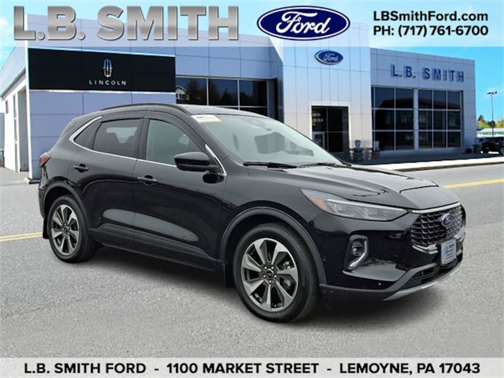 Agate Black Metallic 2023 Ford Escape Hybrid Platinum AWD eCVT 2.5L iVCT 2.5L iVCT, 2.91 Axle Ratio, 4-Wheel Disc Brakes, 6 Speakers, ABS brakes, Active Park Assist 2.0, Air Conditioning, AM/FM radio: SiriusXM, Auto High-beam Headlights, Auto-dimming Rear-View mirror, Automatic temperature control, Black Roof-Rack Side Rails, Brake assist, Bumpers: body-color, Compass, Delay-off headlights, Driver door bin, Driver vanity mirror, Dual front impact airbags, Dual front side impact airbags, Electronic Fuel Door Release, Electronic Stability Control, Emergency communication system: SYNC 4 911 Assist, Equipment Group 600A, Exterior Parking Camera Rear, FordPass Connect, Four wheel independent suspension, Front & Rear Floor Liners w/o Carpet Mats, Front anti-roll bar, Front Bucket Seats, Front Center Armrest, Front dual zone A/C, Front fog lights, Front License Plate Bracket, Front reading lights, Fully automatic headlights, Garage door transmitter, HD Radio, Head-Up Display, Heated ActiveX Trimmed Front Sport Contour Bucket Seats, Heated door mirrors, Heated front seats, Heated Leather-Trimmed Front Sport Contour Seats, Heated steering wheel, Illuminated entry, Knee airbag, Low tire pressure warning, Memory seat, Neutral Towing Capability, Occupant sensing airbag, Outside temperature display, Overhead airbag, Overhead console, Panic alarm, Panoramic Vista Roof, Passenger door bin, Passenger vanity mirror, Pedestrian Alert Sounder, Power door mirrors, Power driver seat, Power Liftgate, Power passenger seat, Power steering, Power windows, Premium Technology Package, Radio: B&O Sound System by Bang & Olufsen, Rain sensing wipers, Rear anti-roll bar, Rear reading lights, Rear seat center armrest, Rear window defroster, Rear window wiper, Remote keyless entry, Security system, Speed control, Speed-sensing steering, Speed-Sensitive Wipers, Split folding rear seat, Spoiler, Steering wheel mounted audio controls, SYNC 4 w/Enhanced Voice Recognition, Telescoping steering wheel, Tilt steering wheel, Traction control, Trip computer, Variably intermittent wipers, Wheels: 19" Machined-Face Aluminum.