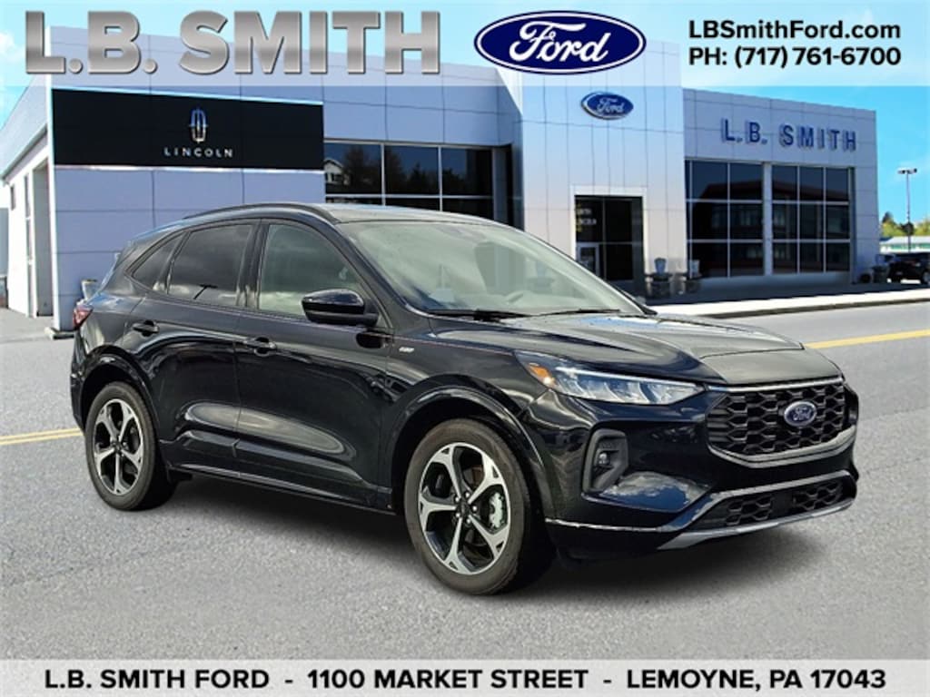 Certified. Agate Black Metallic 2024 Ford Escape ST-Line Select AWD 8-Speed Automatic EcoBoost 2.0L I4 GTDi DOHC Turbocharged VCT AWD, 10-Way Power Driver's Seat, 12.3" Productivity Screen in Instrument Cluster, 2.91 Axle Ratio, 360-Degree Camera w/Split View, 4-Wheel Disc Brakes, 6 Speakers, 6-Way Power Passenger Seat, ABS brakes, Adaptive Cruise Control w/Stop-and-Go, Air Conditioning, AM/FM radio: SiriusXM, Auto High-beam Headlights, Automatic temperature control, Black Roof-Rack Side Rails, Body Color Mirrors, Brake assist, Bumpers: body-color, Class II Trailer Tow Package, Compass, Connected Navigation, Delay-off headlights, Driver door bin, Driver vanity mirror, Dual front impact airbags, Dual front side impact airbags, Electronic Fuel Door Release, Electronic Stability Control, Emergency communication system: SYNC 4 911 Assist, Equipment Group 401A, Exterior Parking Camera Rear, Ford Co-Pilot360 Assist 2.0, FordPass Connect, Four wheel independent suspension, Front anti-roll bar, Front Bucket Seats, Front Center Armrest, Front dual zone A/C, Front fog lights, Front reading lights, Fully automatic headlights, HD Radio, Heated door mirrors, Heated front seats, Heated steering wheel, Heated Vinyl/Cloth Front Sport Contour Bucket Seats, Illuminated entry, Intersection Assist, Knee airbag, Low tire pressure warning, Memory Package, Neutral Towing Capability, Occupant sensing airbag, Outside temperature display, Overhead airbag, Overhead console, Panic alarm, Panoramic Vista Roof, Passenger door bin, Passenger vanity mirror, Pedestrian Alert Sounder, Power door mirrors, Power driver seat, Power Liftgate, Power steering, Power windows, Radio: B&O Sound System by Bang & Olufsen, Rear anti-roll bar, Rear Parking Sensor, Rear reading lights, Rear seat center armrest, Rear window defroster, Rear window wiper, Remote keyless entry, Reverse Brake Assist, Road Side Assistance Kit, Roof rack: rails only, Speed control, Speed Sign Recognition, Speed-sensing steering, Speed-Sensitive Wipers, Split folding rear seat, Spoiler, Sport steering wheel, Steering wheel mounted audio controls, SYNC 4 w/Enhanced Voice Recognition, Tachometer, Tech Pack #2, Telescoping steering wheel, Tilt steering wheel, Traction control, Trip computer, Variably intermittent wipers, Wheels: 19" Machined-Face Ebony-Painted Aluminum, Wireless Charging Pad.