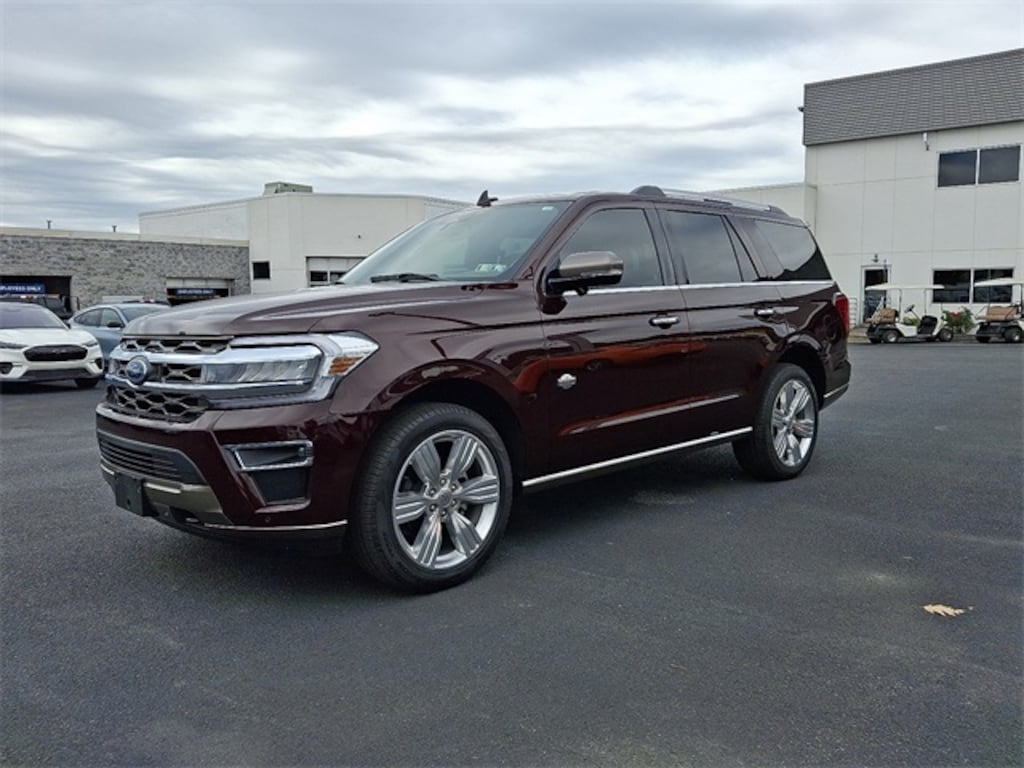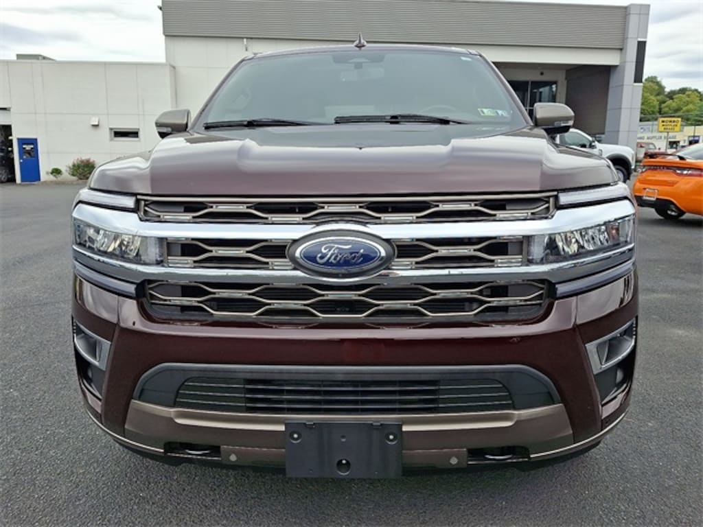 Certified. Red Metallic 2024 Ford Expedition King Ranch 4WD 10-Speed Automatic EcoBoost 3.5L V6 GTDi DOHC 24V Twin Turbocharged 4WD, 1st & 2nd Row Floor Liners w/Carpet Mats, 22 Speakers, 26mm Engine Radiator, 3.73 Axle Ratio, 360-Degree Camera w/Trailer Reverse Guidance, 3rd row seats: split-bench, 4-Wheel Disc Brakes, ABS brakes, Adjustable pedals, Air Conditioning, AM/FM radio: SiriusXM with 360L, Auto High-beam Headlights, Auto-dimming door mirrors, Auto-dimming Rear-View mirror, Automatic temperature control, Brake assist, Bumpers: body-color, Compass, Continuous Controlled Damping (CCD), Delay-off headlights, Driver door bin, Driver vanity mirror, Dual front impact airbags, Dual front side impact airbags, Electronic Stability Control, Emergency communication system: SYNC 4 911 Assist, Equipment Group 400A Standard Package, Exterior Parking Camera Rear, Four wheel independent suspension, Front anti-roll bar, Front Bucket Seats, Front Center Armrest, Front dual zone A/C, Front fog lights, Front License Plate Bracket, Front reading lights, Front Tow Hooks, Fully automatic headlights, Garage door transmitter, Genuine wood console insert, Genuine wood dashboard insert, Genuine wood door panel insert, Heated door mirrors, Heated front seats, Heated rear seats, Heated steering wheel, Heated/Vent Prem Del Rio Lthr Fr Captain's Chairs, Heavy-Duty Trailer Tow Package, Illuminated entry, Integrated Trailer Brake Controller, Leather steering wheel, Low tire pressure warning, Memory seat, Navigation system: Connected Navigation, Occupant sensing airbag, Outside temperature display, Overhead airbag, Overhead console, Panic alarm, Passenger door bin, Passenger vanity mirror, Pedal memory, Power door mirrors, Power driver seat, Power Liftgate, Power moonroof, Power passenger seat, Power steering, Power windows, Pro Trailer Backup Assist, Radio: B&O Unleashed Sound System by Bang & Olufsen, Rain sensing wipers, Rear air conditioning, Rear anti-roll bar, Rear reading lights, Rear window defroster, Rear window wiper, Reclining 3rd row seat, Remote keyless entry, Security system, SiriusXM w/360L, Speed control, Speed-sensing steering, Speed-Sensitive Wipers, Split folding rear seat, Spoiler, Steering wheel memory, Steering wheel mounted audio controls, SYNC 4 w/Enhanced Voice Recognition, Tachometer, Telescoping steering wheel, Tilt steering wheel, Traction control, Trip computer, Turn signal indicator mirrors, Variably intermittent wipers, Ventilated front seats, Voltmeter, Wheels: 22" 6-Spoke Polished Aluminum.