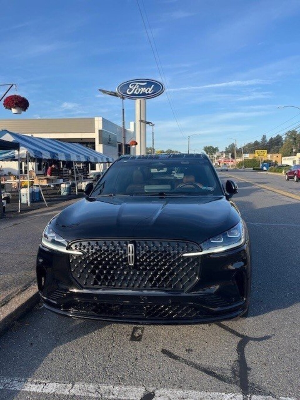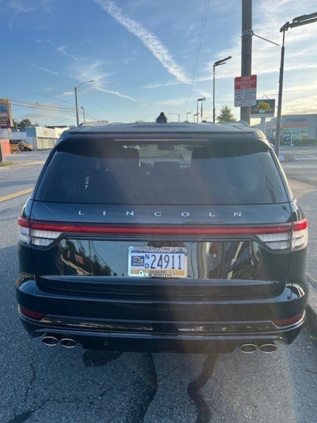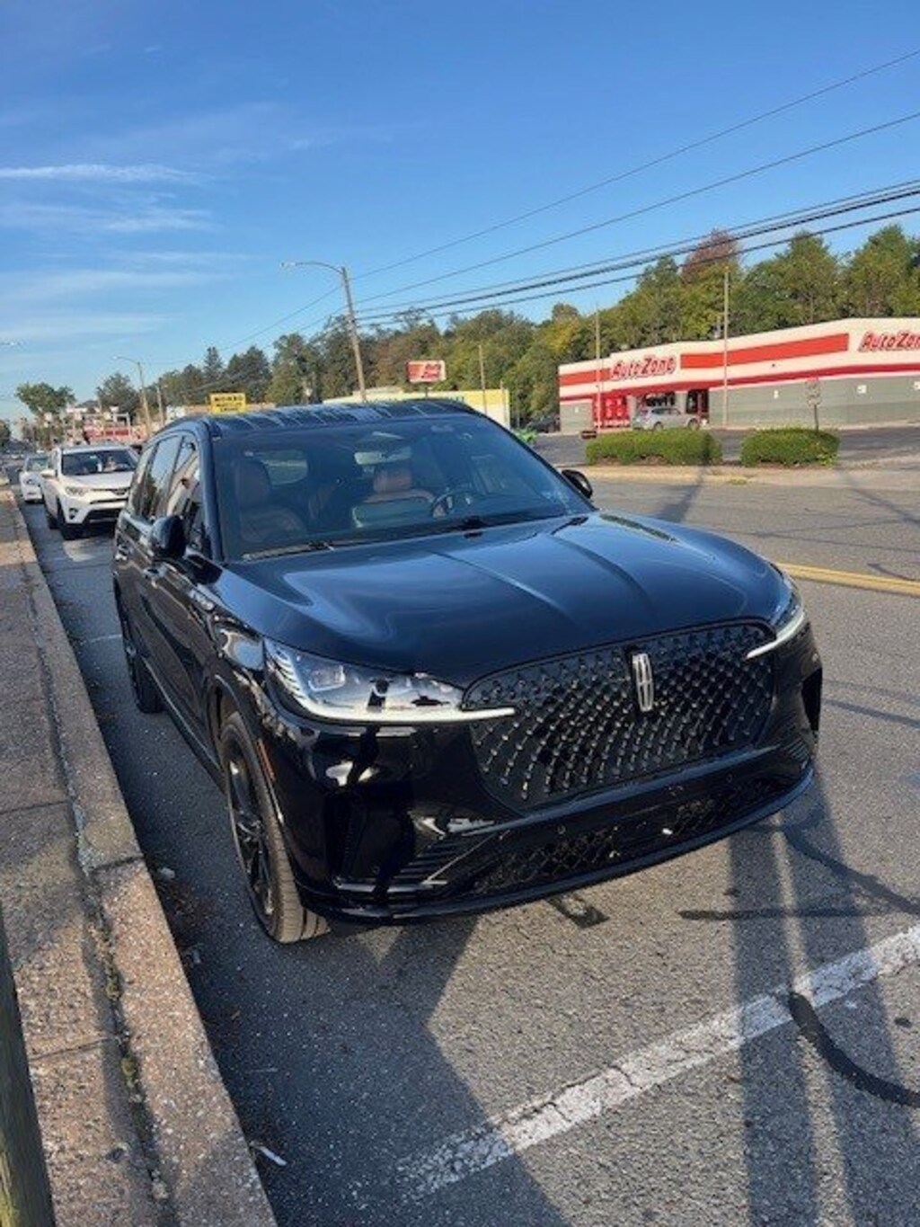 Certified. Black Metallic 2025 Lincoln Aviator Reserve AWD 10-Speed Automatic 3.0L V6 14 Speakers, 3rd row seats: split-bench, 4-Wheel Disc Brakes, 40/Mini Console/40 Dual Captain's Chairs, ABS brakes, Adaptive Dynamic Bending Lighting, Adaptive Pixel LED Headlamps, Adaptive suspension, Advanced Heads-Up Display, Air Conditioning, AM/FM radio: SiriusXM, Apple CarPlay/Android Auto, Auto Air Refresh, Auto High-beam Headlights, Auto-dimming door mirrors, Auto-dimming Rear-View mirror, Automatic temperature control, Black Exterior Elements, Body-Color Exterior Elements, Brake assist, Bumpers: body-color, Compass, Delay-off headlights, Driver door bin, Driver vanity mirror, Dual front impact airbags, Dual front side impact airbags, Electronic Stability Control, Emergency communication system: 911 Assist, Equipment Group 200A, Four wheel independent suspension, Front anti-roll bar, Front Bucket Seats, Front Center Armrest, Front dual zone A/C, Front reading lights, Fully automatic headlights, Garage door transmitter, Genuine wood console insert, Genuine wood dashboard insert, Heads-Up Display, Heated door mirrors, Heated front seats, Heated steering wheel, HVAC memory, Illuminated entry, Illuminated Lincoln Star in Grille, Illumination Package, Jet Appearance Package, Knee airbag, Leather steering wheel, Lincoln BlueCruise Equipped (4-Years Included), Lincoln Digital Experience, Lincoln Dynamic Signature Lighting, Low tire pressure warning, Memory seat, Navigation System, Occupant sensing airbag, Outside temperature display, Overhead airbag, Overhead console, Panic alarm, Passenger door bin, Passenger vanity mirror, Power door mirrors, Power driver seat, Power Liftgate, Power moonroof: Panoramic Vista Roof, Power passenger seat, Power steering, Power windows, Premium Lthr Heated/Ventilated Fnt Captain's Chairs, Radio: Revel Audio System w/14 Speakers, Rain sensing wipers, Rear air conditioning, Rear anti-roll bar, Rear audio controls, Rear dual zone A/C, Rear reading lights, Rear window defroster, Rear window wiper, Remote keyless entry, Security system, SiriusXM, Speed control, Speed Dependent Lighting, Speed-Sensitive Wipers, Split folding rear seat, Spoiler, Steering wheel memory, Steering wheel mounted A/C controls, Steering wheel mounted audio controls, Tachometer, Telescoping steering wheel, Tilt steering wheel, Traction control, Trip computer, Turn signal indicator mirrors, Variably intermittent wipers, Ventilated front seats, Wheels: 22" Black Aluminum w/Adaptive Suspension, Wireless Charging Pad.