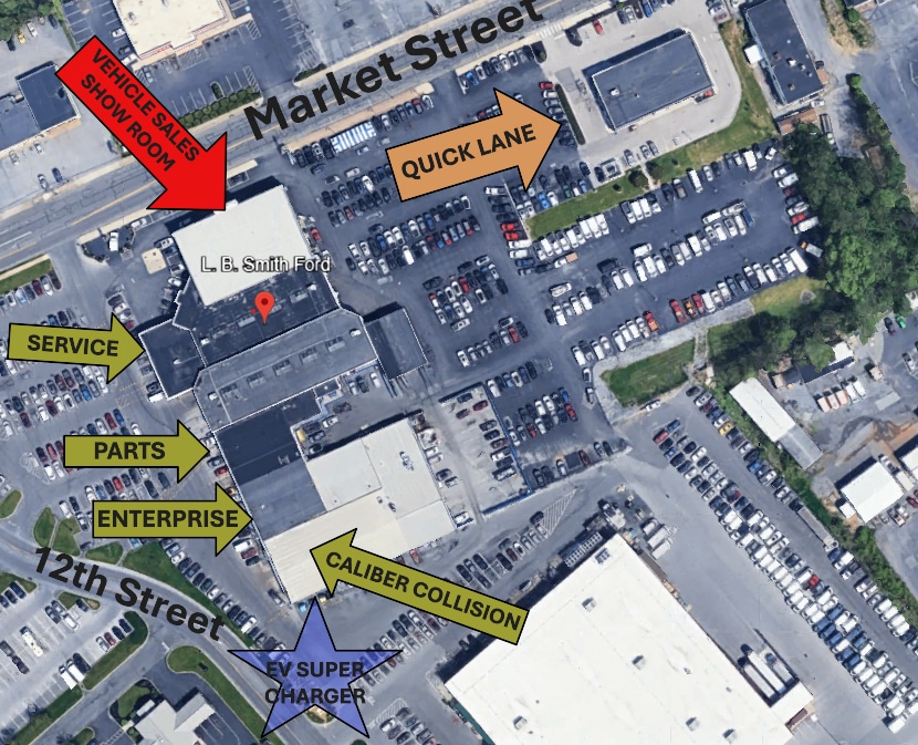Nearly next-door neighbors, Camp Hill is only five minutes from our dealership. You'll head east on Market Street toward South 21st Street to get to us. Pass by a Valvoline Instant Oil Change. Turn right. L.B. Smith Ford will be on your left.