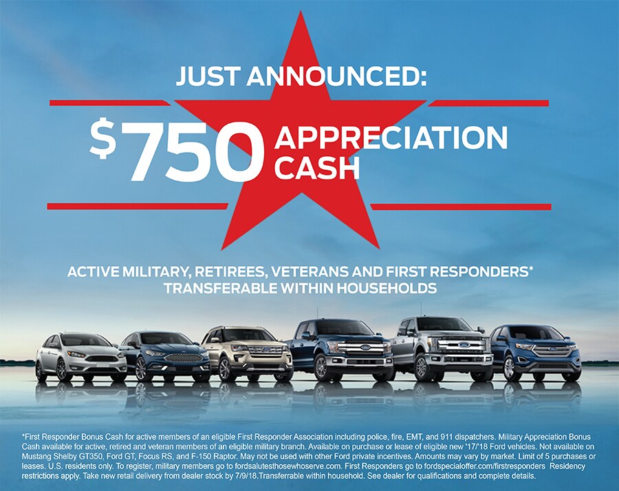 Ford Motor Company is proud to celebrate Memorial Day, Flag Day and July 4th by honoring our Military Heroes and First Responders. Ford is enhancing the national Ford Military Appreciation and First Responder programs to a $750 offer effective May 15th through July 9th. During this period, the Military Appreciation Program is expanded to all Veterans regardless of separation date. Upon conclusion of the offer on July 10th, the program will revert back to $500 Bonus Cash for only those Veterans within 2 years of separation. A summary of both programs is below.