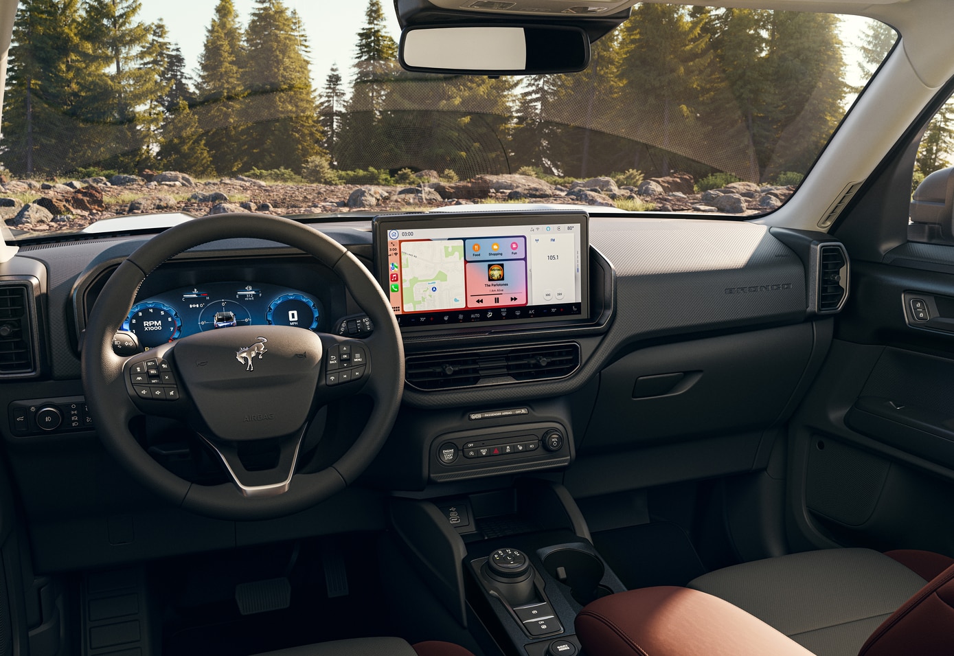 Every model of the 2026 Ford Bronco Sport comes standard with Ford's SYNC 4 infotainment system displayed on a 13.2-inch touchscreen, providing wireless Apple CarPlay® and Android Auto™ integration and built-in conversational voice command recognition. A 12.3-inch digital instrument cluster also appears across the lineup.