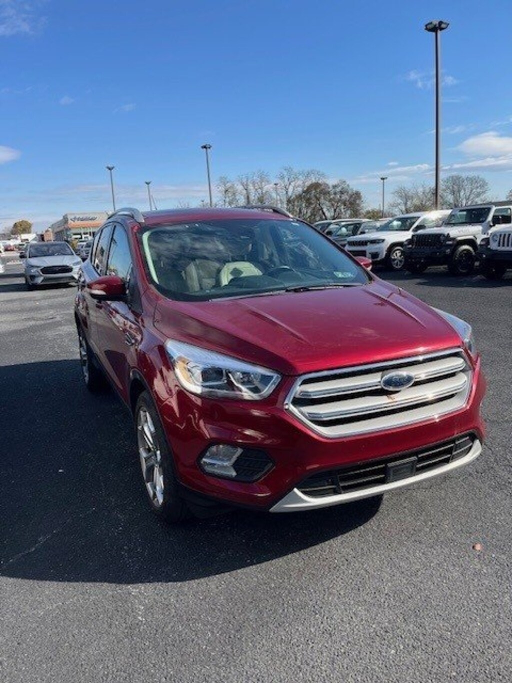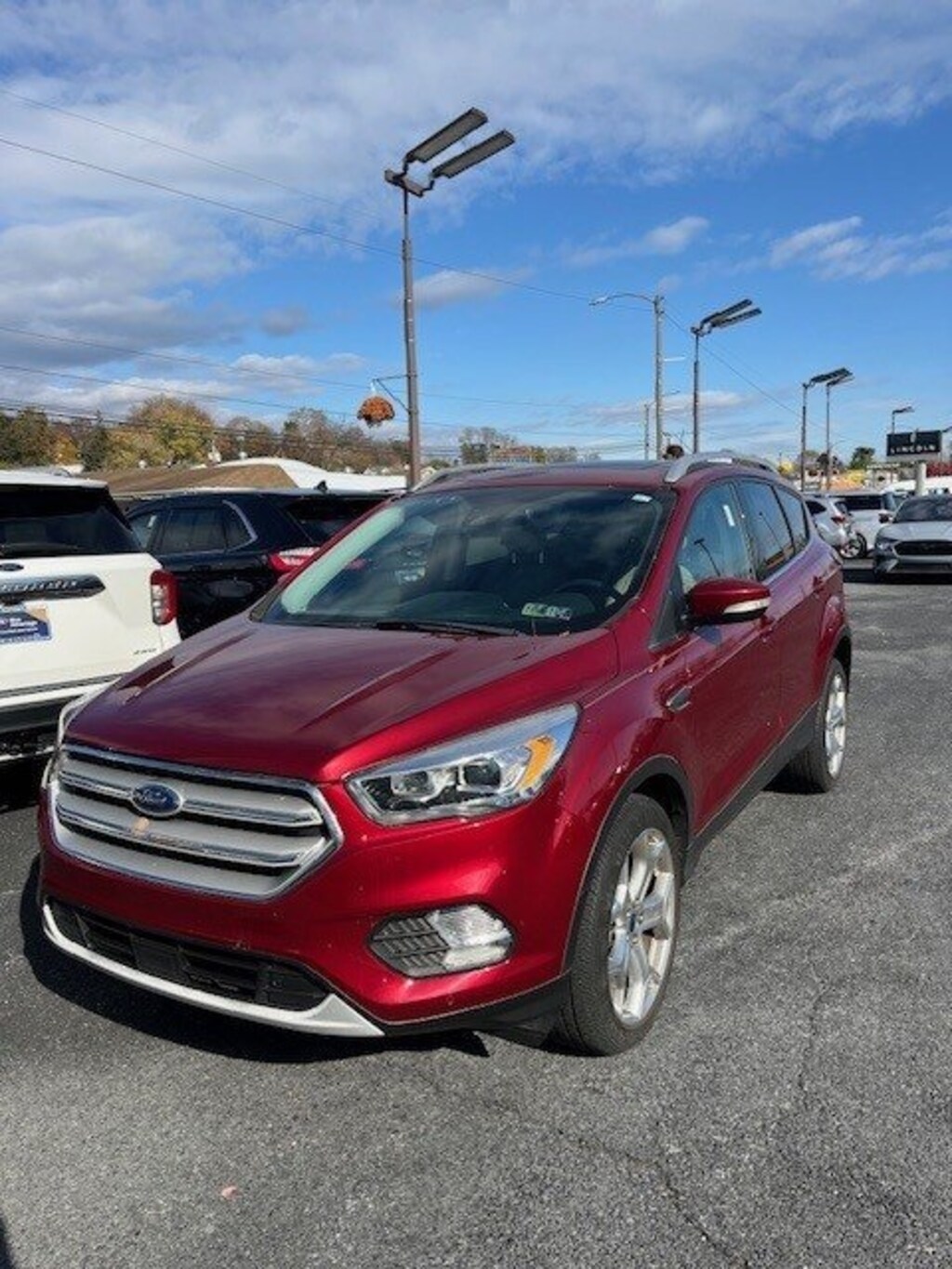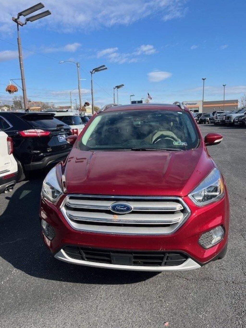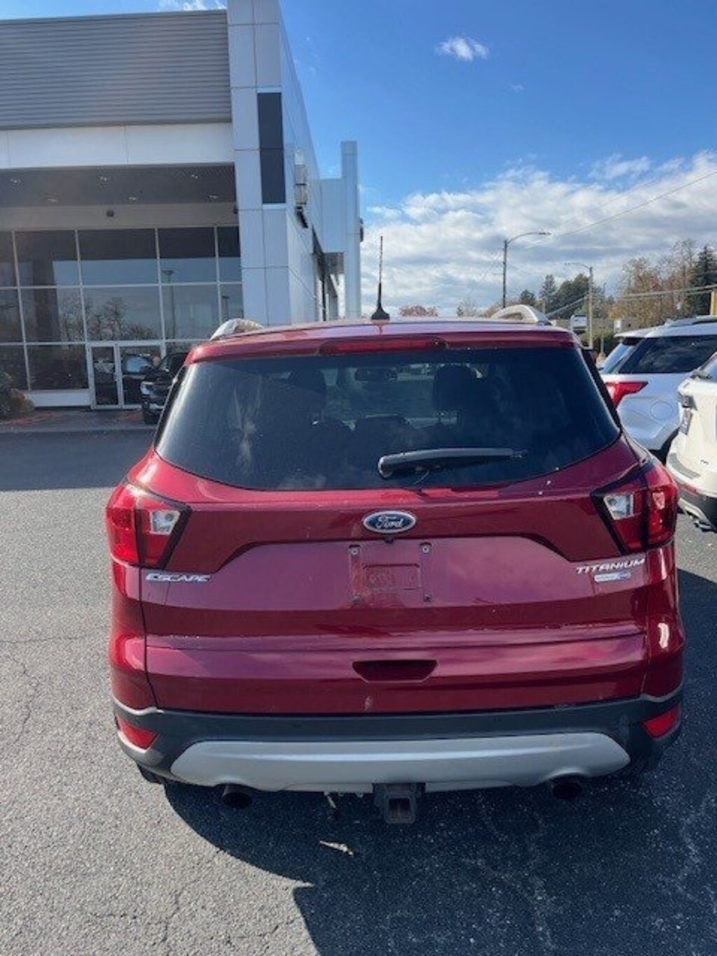 Ruby Red Metallic Tinted Clearcoat 2019 Ford Escape Titanium 4WD 6-Speed Automatic EcoBoost 2.0L I4 GTDi DOHC Turbocharged VCT 4WD, 10 Speakers, 2.0L EcoBoost Class II Trailer Tow Package, 3.07 Axle Ratio, 4-Wheel Disc Brakes, ABS brakes, Adaptive Cruise Control & Fwd Collision Warning, Air Conditioning, AM/FM radio: SiriusXM, AppLink/Apple CarPlay and Android Auto, Auto High-Beam Headlamps, Auto-dimming Rear-View mirror, Automatic temperature control, Auxiliary Transmission Oil Cooler, Blind Spot Info System w/Cross-Traffic Alert, Brake assist, Bumpers: body-color, Compass, Delay-off headlights, Driver door bin, Driver vanity mirror, Dual front impact airbags, Dual front side impact airbags, Electronic Stability Control, Emergency communication system: SYNC 3 911 Assist, Equipment Group 400A, Exterior Parking Camera Rear, Ford Safe and Smart Titanium Plus Package, FordPass Connect, Four wheel independent suspension, Front anti-roll bar, Front Bucket Seats, Front Center Armrest, Front dual zone A/C, Front fog lights, Front reading lights, Fully automatic headlights, Garage door transmitter, Heated door mirrors, Heated front seats, Heated Leather-Trimmed Front Bucket Seats, Heated steering wheel, High-Intensity Discharge Headlights, Illuminated entry, Knee airbag, Lane-Keeping System, Leather Shift Knob, Low tire pressure warning, Memory seat, Navigation System, Occupant sensing airbag, Outside temperature display, Overhead airbag, Overhead console, Panic alarm, Panoramic Vista Roof, Passenger door bin, Passenger vanity mirror, Power door mirrors, Power driver seat, Power Liftgate, Power passenger seat, Power steering, Power windows, Rain-Sensing Wipers, Rear anti-roll bar, Rear reading lights, Rear seat center armrest, Rear window defroster, Rear window wiper, Remote keyless entry, Roof rack: rails only, Security system, Speed control, Speed-sensing steering, Split folding rear seat, Steering wheel mounted audio controls, SYNC 3 Communications & Entertainment System, Tachometer, Telescoping steering wheel, Tilt steering wheel, Traction control, Trip computer, Turn signal indicator mirrors, Variably intermittent wipers, Voice-Activated Touchscreen Navigation System, Wheels: 19" Bright-Machined Aluminum.