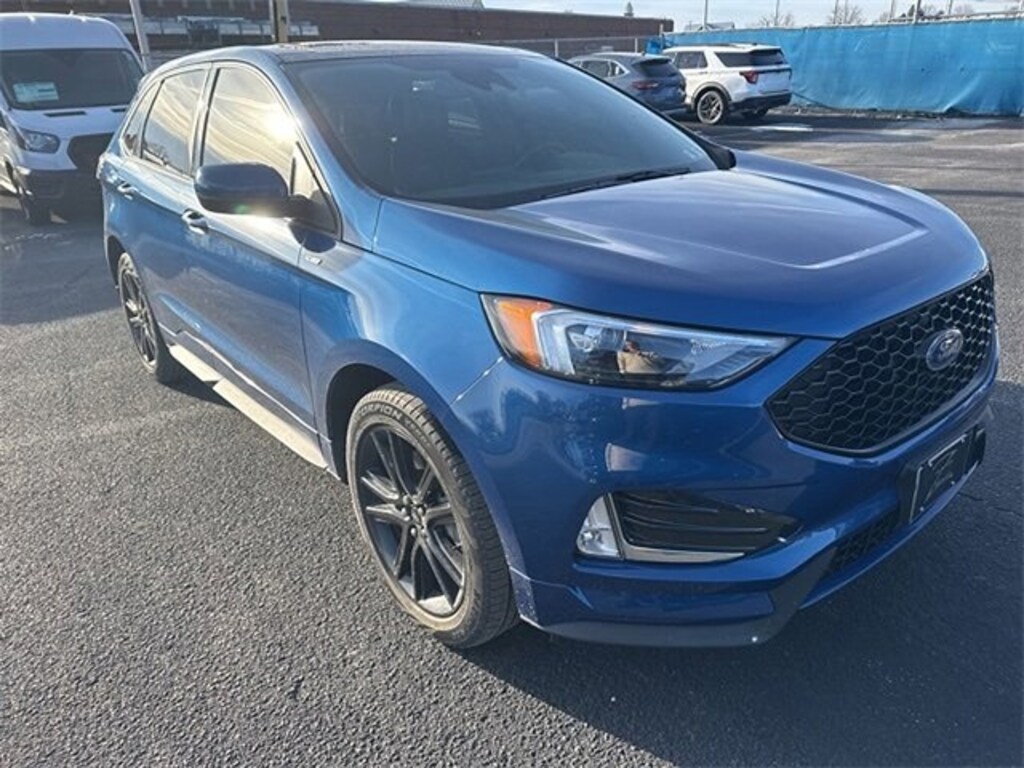 Priced below KBB Fair Purchase Price! Blue 2022 Ford Edge ST Line AWD 8-Speed Automatic EcoBoost 2.0L I4 GTDi DOHC Turbocharged VCT AWD, 3.80 Axle Ratio, 4-Wheel Disc Brakes, 6 Speakers, ABS brakes, ActiveX Seating Material Heated Bucket Seats, Air Conditioning, AM/FM radio: SiriusXM with 360L, Auto High-beam Headlights, Auto-dimming Rear-View mirror, Automatic temperature control, Brake assist, Bumpers: body-color, Class II Trailer Tow Package, Compass, Delay-off headlights, Driver door bin, Driver vanity mirror, Dual front impact airbags, Dual front side impact airbags, Electronic Stability Control, Emergency communication system: SYNC 4 911 Assist, Equipment Group 250A, FordPass Connect, Four wheel independent suspension, Front anti-roll bar, Front Bucket Seats, Front Center Armrest w/Storage, Front dual zone A/C, Front fog lights, Front reading lights, Fully automatic headlights, Garage door transmitter, Heated door mirrors, Heated front seats, Illuminated entry, Knee airbag, Low tire pressure warning, Navigation System, Occupant sensing airbag, Outside temperature display, Overhead airbag, Overhead console, Panic alarm, Passenger door bin, Passenger vanity mirror, Power door mirrors, Power driver seat, Power Liftgate, Power passenger seat, Power steering, Power windows, Rear anti-roll bar, Rear Parking Sensors, Rear reading lights, Rear seat center armrest, Rear window defroster, Rear window wiper, Remote keyless entry, Security system, SiriusXM w/360L, Speed control, Speed-Sensitive Wipers, Split folding rear seat, Spoiler, Steering wheel mounted audio controls, SYNC 4A w/Enhanced Voice Recognition, Tachometer, Telescoping steering wheel, Tilt steering wheel, Traction control, Trip computer, Variably intermittent wipers, Wheels: 20" Premium Gloss Black-Painted Aluminum.
