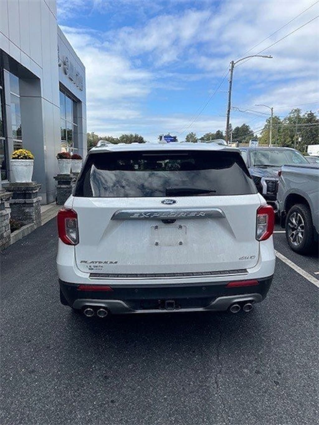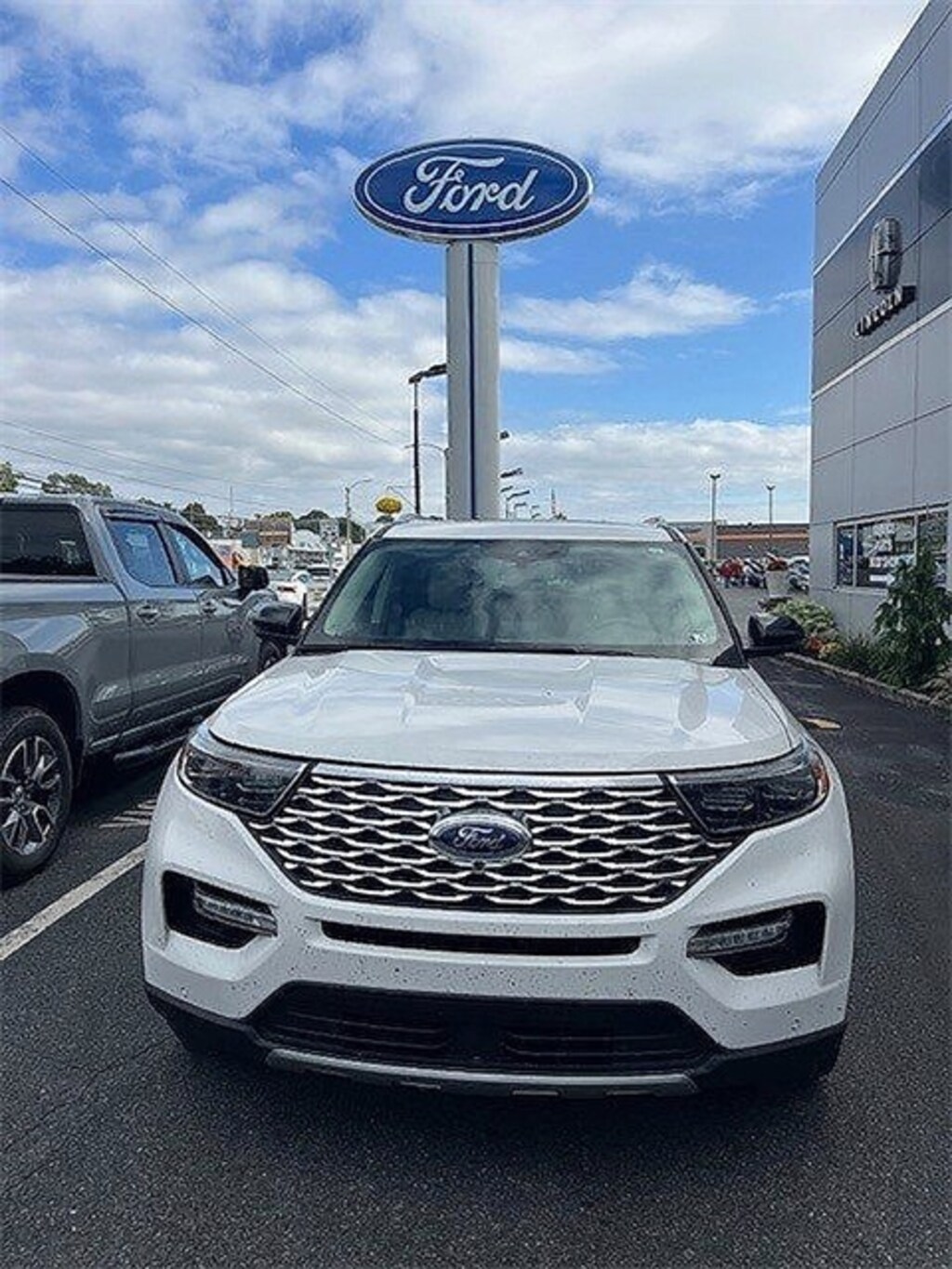 White 2023 Ford Explorer Platinum 4WD 10-Speed Automatic 3.0L EcoBoost V6 4WD, 12 Speakers, 2 Additional Speakers, 3.31 Non-Limited-Slip Rear Axle Ratio, 3rd row seats: bench, 4-Wheel Disc Brakes, ABS brakes, Active Cruise Control, Air Conditioning, AM/FM radio: SiriusXM, Auto High-beam Headlights, Auto-dimming door mirrors, Auto-dimming Rear-View mirror, Automatic temperature control, Brake assist, Bumpers: body-color, Class IV Trailer Tow Package, Compass, Delay-off headlights, Driver door bin, Driver vanity mirror, Dual front impact airbags, Dual front side impact airbags, Electronic Stability Control, Emergency communication system: SYNC 3 911 Assist, Equipment Group 601A, Exterior Parking Camera Rear, FordPass Connect, Four wheel independent suspension, Front anti-roll bar, Front Bucket Seats, Front Center Armrest, Front dual zone A/C, Front fog lights, Front reading lights, Fully automatic headlights, Garage door transmitter, Genuine wood dashboard insert, Heated door mirrors, Heated front seats, Heated rear seats, Heated steering wheel, Illuminated entry, Knee airbag, Leather Htd/Ventilated Sport Captain's Chairs, Leather steering wheel, Low tire pressure warning, Memory seat, Navigation System, Occupant sensing airbag, Outside temperature display, Overhead airbag, Overhead console, Panic alarm, Passenger door bin, Passenger vanity mirror, Power door mirrors, Power driver seat, Power Liftgate, Power passenger seat, Power steering, Power windows, Radio: B&O Sound System by Bang & Olufsen, Radio: B&O Sound w/14 Speakers/HD Radio (DISC), Rain sensing wipers, Rear air conditioning, Rear anti-roll bar, Rear reading lights, Rear window defroster, Rear window wiper, Remote keyless entry, Roof rack: rails only, Security system, Speed control, Speed-sensing steering, Speed-Sensitive Wipers, Split folding rear seat, Spoiler, Steering wheel memory, Steering wheel mounted audio controls, SYNC 3 Communications & Entertainment System, SYNC 3/Apple CarPlay/Android Auto, Tachometer, Technology Package, Telescoping steering wheel, Tilt steering wheel, Traction control, Trip computer, Turn signal indicator mirrors, Twin Panel Moonroof, Variably intermittent wipers, Ventilated front seats, Voice-Activated Touchscreen Navigation System, Wheels: 21" Bright Machined-Face Aluminum.