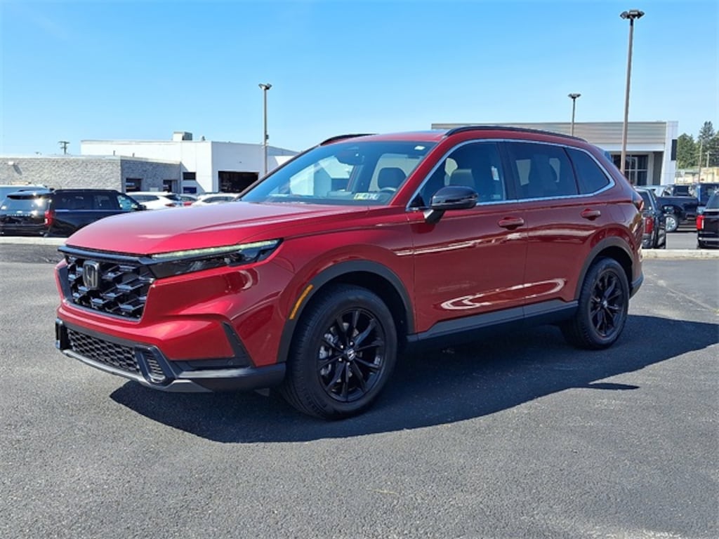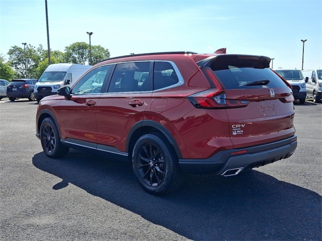 Red Metallic 2024 Honda CR-V Hybrid Sport-L AWD eCVT 2.0L I4 DOHC 16V 2.0L I4 DOHC 16V, 4-Wheel Disc Brakes, 4.438 Axle Ratio, 8 Speakers, ABS brakes, Adaptive Cruise Control: Adaptive Cruise Control (ACC) with Low-Speed Follow, Air Conditioning, AM/FM radio: SiriusXM, Auto High-beam Headlights, Auto-dimming Rear-View mirror, Automatic temperature control, Blind Spot Information (BSI) System warning, Brake assist, Bumpers: body-color, Compass, Delay-off headlights, Driver door bin, Driver vanity mirror, Dual front impact airbags, Dual front side impact airbags, Electronic Stability Control, Exterior Parking Camera Rear, Four wheel independent suspension, Front anti-roll bar, Front Bucket Seats, Front Center Armrest, Front dual zone A/C, Front reading lights, Fully automatic headlights, Heated door mirrors, Heated Front Bucket Seats, Heated front seats, Illuminated entry, Knee airbag, Leather Seat Trim, Leather Shift Knob, Leather steering wheel, Low tire pressure warning, Memory seat, Occupant sensing airbag, Outside temperature display, Overhead airbag, Overhead console, Panic alarm, Passenger door bin, Passenger vanity mirror, Power door mirrors, Power driver seat, Power Liftgate, Power moonroof, Power passenger seat, Power steering, Power windows, Radio: 320-Watt AM/FM/HD/SiriusXM Audio System, Rear anti-roll bar, Rear reading lights, Rear seat center armrest, Rear side impact airbag, Rear window defroster, Rear window wiper, Remote keyless entry, Security system, Speed control, Speed-sensing steering, Speed-Sensitive Wipers, Split folding rear seat, Spoiler, Steering wheel mounted audio controls, Telescoping steering wheel, Tilt steering wheel, Traction control, Trip computer, Turn signal indicator mirrors, Variably intermittent wipers, Wheels: 18" Berlina Black Alloy, Wireless Apple CarPlay/Wireless Android Auto.