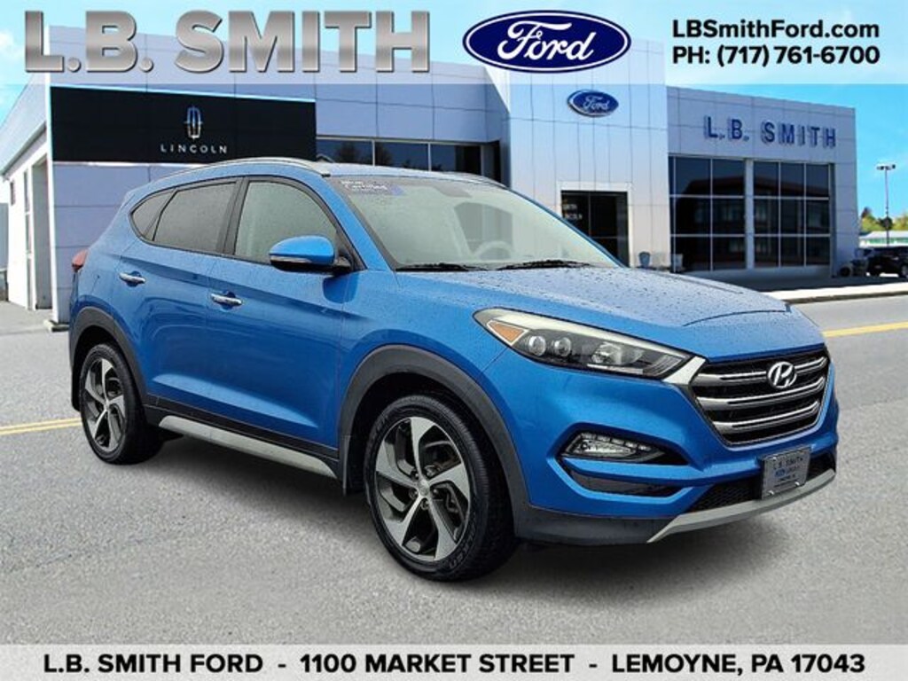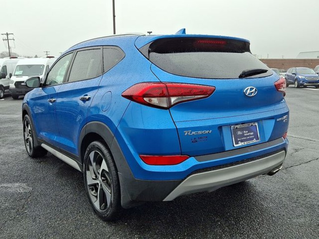 Caribbean Blue 2018 Hyundai Tucson Limited AWD 7-Speed Automatic 1.6L I4 DGI Turbocharged DOHC 16V ULEV II 175hp AWD, 4-Wheel Disc Brakes, 8 Speakers, ABS brakes, Air Conditioning, AM/FM radio: SiriusXM, Apple CarPlay & Android Auto, Auto-dimming Rear-View mirror, Automatic temperature control, Axle Ratio: 3.579, Brake assist, Bumpers: body-color, Cargo Cover, Cargo Net, Cargo Package, Cargo Tray, Carpeted Floor Mats, Compass, Delay-off headlights, Driver door bin, Driver vanity mirror, Dual front impact airbags, Dual front side impact airbags, Electronic Stability Control, Emergency communication system: Blue Link, Exterior Parking Camera Rear, First Aid Kit, Four wheel independent suspension, Front anti-roll bar, Front Bucket Seats, Front Center Armrest, Front dual zone A/C, Front fog lights, Front reading lights, Fully automatic headlights, Garage door transmitter: HomeLink, Heated door mirrors, Heated Front Bucket Seats, Heated front seats, Heated steering wheel, Illuminated entry, Leather Seat Trim, Leather Shift Knob, Low tire pressure warning, Navigation System, Occupant sensing airbag, Outside temperature display, Overhead airbag, Overhead console, Panic alarm, Passenger door bin, Passenger vanity mirror, Power door mirrors, Power driver seat, Power Liftgate, Power passenger seat, Power steering, Power windows, Radio: AM/FM/HD Radio/MP3/Navigation Audio System, Rear anti-roll bar, Rear Bumper Applique, Rear seat center armrest, Rear window defroster, Rear window wiper, Remote keyless entry, Roof rack: rails only, Security system, Speed control, Speed-sensing steering, Split folding rear seat, Spoiler, Steering wheel mounted audio controls, Tachometer, Telescoping steering wheel, Tilt steering wheel, Traction control, Trip computer, Turn signal indicator mirrors, Variably intermittent wipers, Wheels: 19" x 7.5J Alloy.